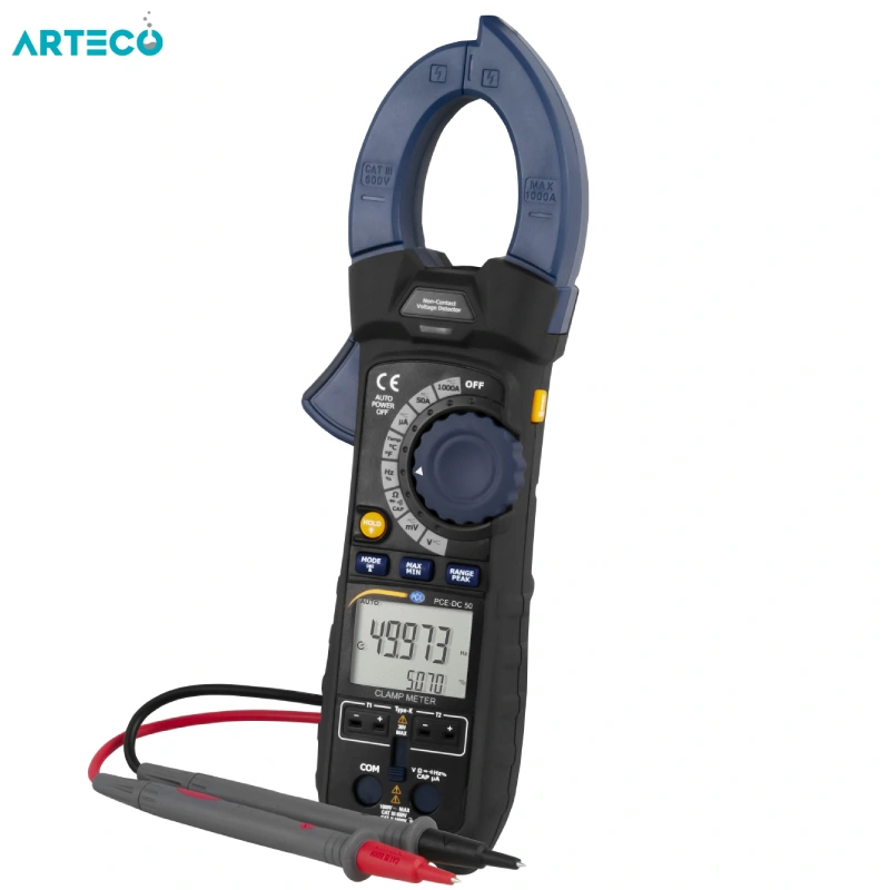 آمپرمتر کلمپی PCE-DC 50 عرضه شده توسط آرکا راد تجارت که یک دستگاه اندازهگیری برای اندازهگیری جریان تا ۱۰۰۰ آمپر AC/DC است. این کلمپ علاوه بر اندازهگیری جریان، میتواند ولتاژ، فرکانس، چرخه کاری، مقاومت، تست پیوستگی، خازنها و دیودها را نیز اندازهگیری و آزمایش کند. قطر محفظه کلمپ ۴۸ میلیمتر است. بنابراین، این محصول از تجهیزات تست و اندازه گیری میتواند اندازهگیریها را روی کابلهایی با سطح مقطع بزرگ نیز انجام دهد. به لطف عملکرد NCVD، میتوان از کلمپ اندازهگیری برای بررسی بدون تماس ولتاژ اعمال شده به کابل استفاده کرد.